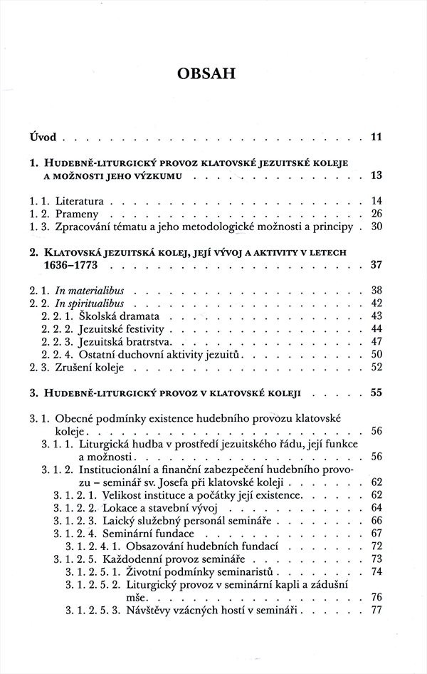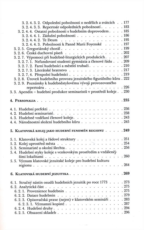 Podrobná a rozsáhlá zpráva v podobě hudebně historických studií a soupisů je založena na regionálních pramenech jezuitské provenience a podává ucelený obraz hudebního života a souvisejícího liturgického provozu v klatovské jezuitské koleji. Autor svou práci uvádí reserší pramenů a literatury a metodologickou statí. Hudební život zkoumané instituce nahlíží z hlediska finančních, personálních, sociálních a zejména hudebně historických podmínek liturgického provozu. V přílohách se nachází katalogy uložených skladeb, filigránů použitých v jezuitských hudebninách, soupisy osob hudebně činných v klatovském semináři nebo školní kalendář roku 1708/1709. Anglické a německé resumé, související literatura, soupis pramenů.