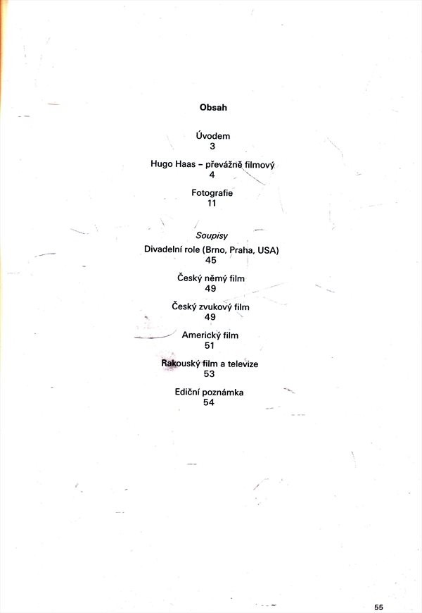 Publikace vydaná u příležitosti výstavy Hugo Haas ve filmové fotografii doplněná o soupis filmových, divadelních a televizních rolí.