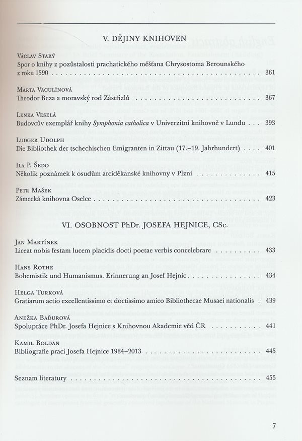 29 příspěvků historiků, filologů, bohemistů a archivářů k životnímu jubileu českého historika, filologa a spisovatele J. Hejnice. Práce věnované zejména české humanistické literatuře, dějinám knihtisku a knihoven a osobě jubilanta.