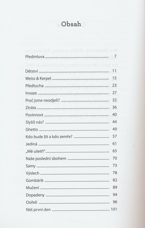 Autobiografické memoáry Evy Slonimové-Weissové poskytují přímé svědectví o holocaustu na Slovensku. Autorka v nich líčí osudy tradiční židovské rodiny z Bratislavy, které se podařilo přežít.