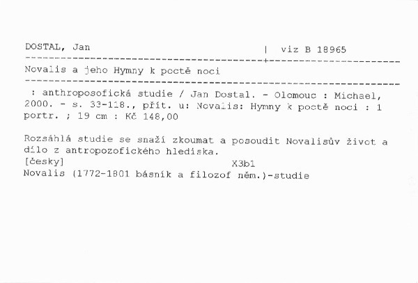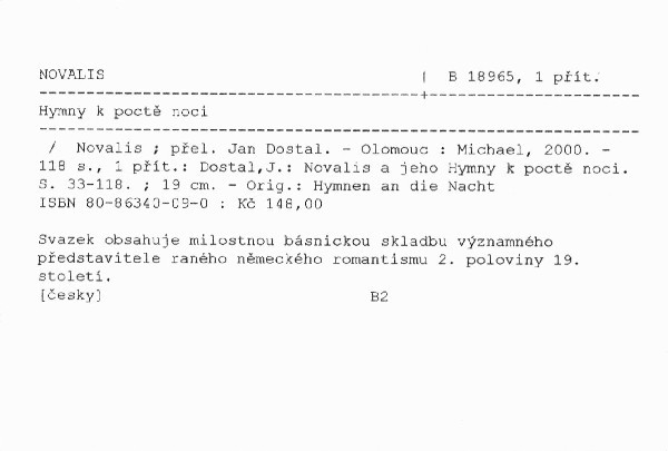 | Rozsah | 118 s., 1 přít.: Dostal,J.: Novalis a jeho Hymny k poctě noci. S. 33-118. |