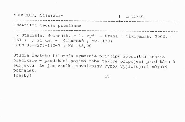 Studie českého filozofa vymezuje principy identitní teorie predikace - predikaci pojímá coby takové připojení predikátu k subjektu, že jím vzniká smysluplný výrok vyjadřující nějaký poznatek.