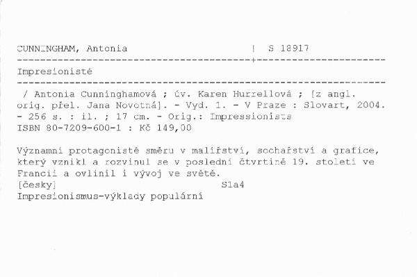 Po všeobecné charakteristice impresionismu a jeho představitelů následují reprodukce a rozbory 120 děl jednotlivých francouzských impresionistických malířů.