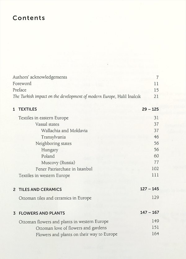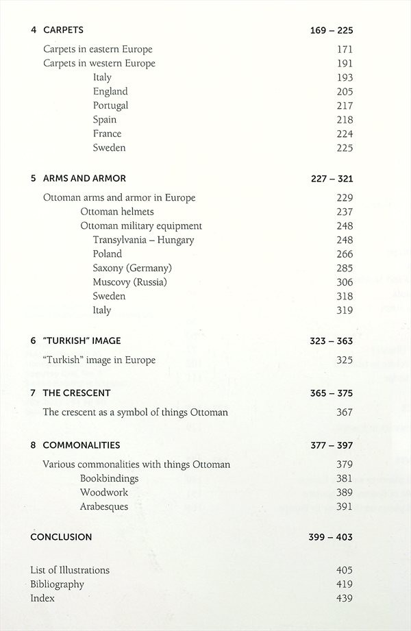 Výpravná obrazová publikace dokumentuje vliv osmanské materiální kultury na různé oblasti evropského uměleckého řemesla a hmotné kultury. Jednotlivé kapitoly se věnují např. textilu a odívání, keramice, kobercům či zbroji.