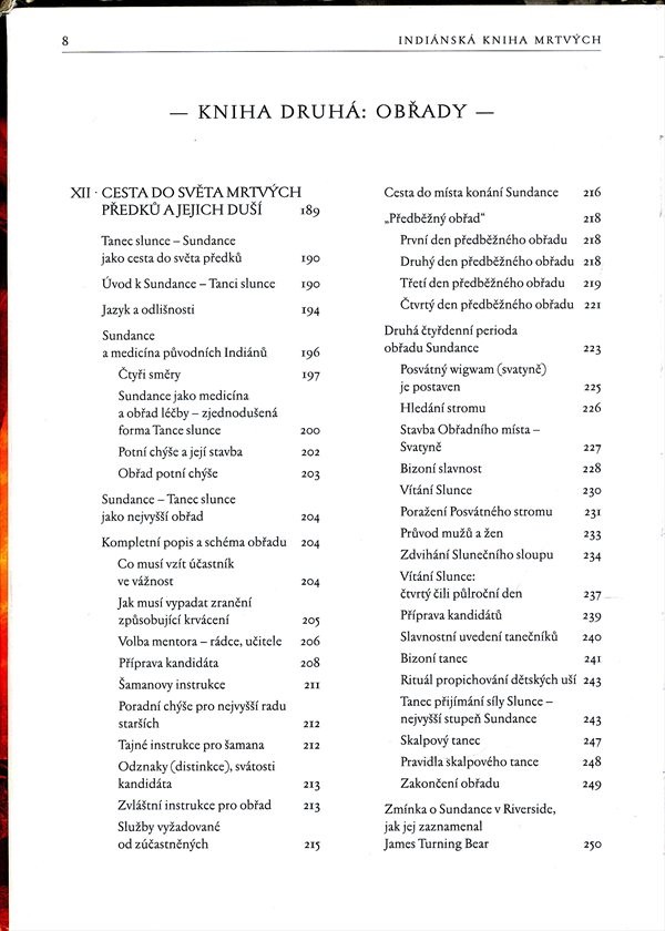Bohatě ilustrovaná publikace o spiritualitě severoamerických Indiánů. Tajemné obřady, rituály, lidské oběti, indiánští bozi, posmrtný život, nebeské úkazy spjaté s posvátnými představami a další zajímavosti o indiánských kulturách patří mezi atraktivní témata této knihy. Zvláštní pozornost je věnována (vzhledem k pestrosti a množství indiánských kmenů a národů) Lakotům-Siouxům. Právě jejich nejvyšší obřad Sundance - Tanec Slunce je zde podrobně, do všech detailů popsán (ještě spolu s obřadem Hunka a Bizoním obřadem). Text prokládají a dokreslují četné fotografie a obrázky. Závěrečná příloha přináší stručná rozdělení severoamerických Indiánů a výčet užívaných pojmů a názvů.