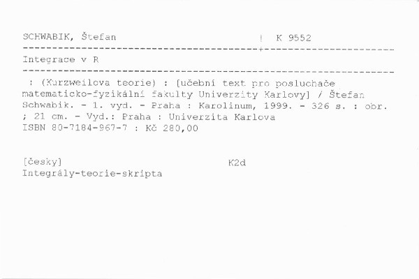 | Podnázev | (Kurzweilova teorie) : [učební text pro posluchače matematicko-fyzikální fakulty Univerzity Karlovy] |