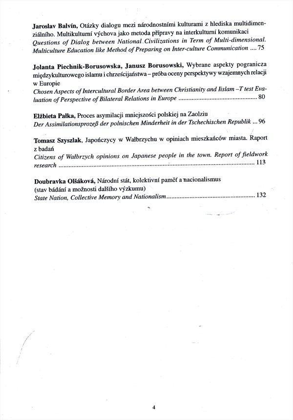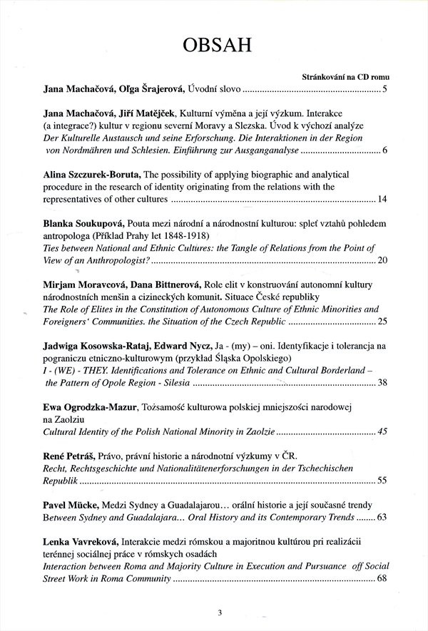 Sborník příspěvků věnovaných problematice interakce kultur a ovlivňování, resp. vztahu národnostní skupin a majoritní společnosti. Publikace obsahuje čtyři úvodní referáty obecnější povahy, ostatní texty jsou na přiloženém CD-ROMu.