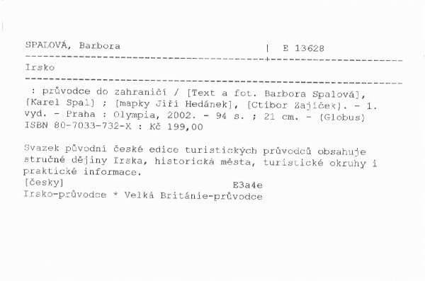 Do svazku jsou zařazeny obě správní části rozděleného ostrova, které z hlediska historického i kulturního patřily k sobě. Průvodce uvádí základní charakteristiku Irské republiky a Severního Irska a přírodní, politicko-hospodářské i kulturní poměry zemí. Turistické oblasti jsou rozdělené podle historických provincií a místopisná část je řazena abecedně. Průvodce obsahuje orientační plánek Corku, Dublinu, Belfastu a Limericku, několik barevných fototografií a místopisný rejstřík. Much E3a4e