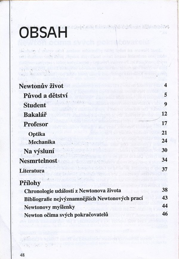Životopis je rozdělen na dětství a mládí, léta profesorského působení na universitě v Cambridge a působení v londýnské mincovně. Autor se zabývá také chybami v Newtonových životních datech vzniklých v důsledku odlišností tehdejšího anglikánského kalendáře a nového gregoriánského kalendáře. Na konci je uveden chronologický přehled událostí Newtonova života a literatura.