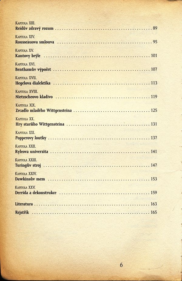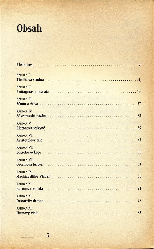 Interpretace základních témat jednotlivých systémů (např. Platónova jeskyně, Occamova břitva, Machiavelliho Vladař, Rousseauova společenská smlouva, Hegelova dialektika, Derridova dekonstrukce) od antických počátků po současné koncepce. Odborně nenáročný výklad se tudíž zaměřuje na pojetí nosného tématu jednotlivých koncepcí...