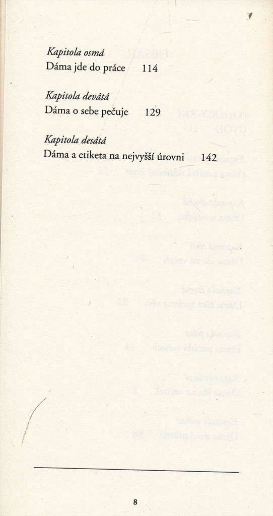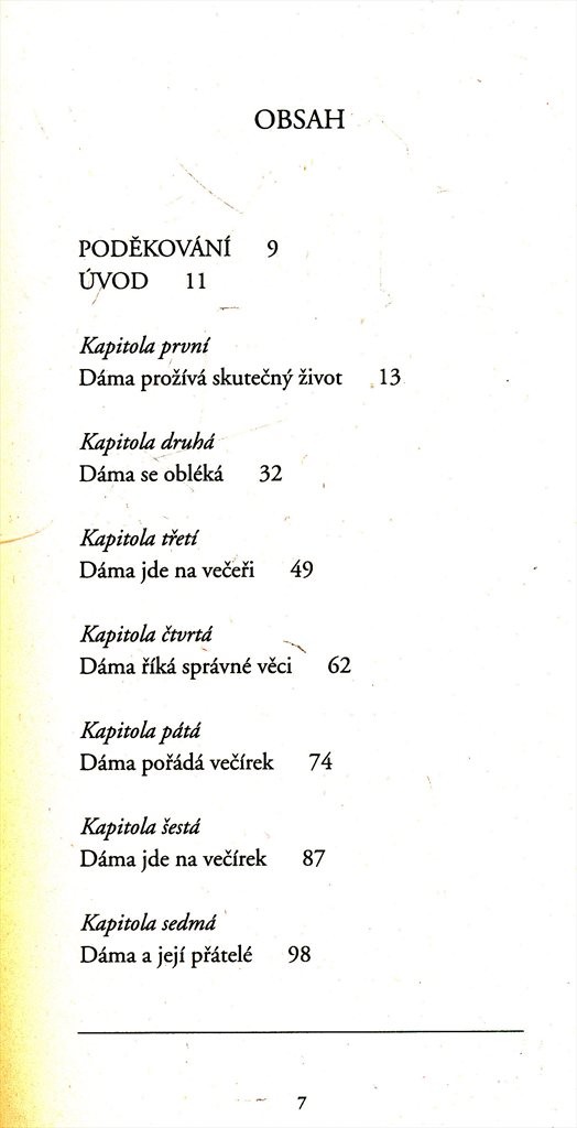 Být ženou neznamená automaticky být také dámou. Současná dáma by měla disponovat vybraným chováním, pevnými hodnotami i vysokou úctou, kterou má k sobě i k ostatním. Příručka podává výčet rad, jež mají čtenářku dovést ke kýženému cíli být dámou.