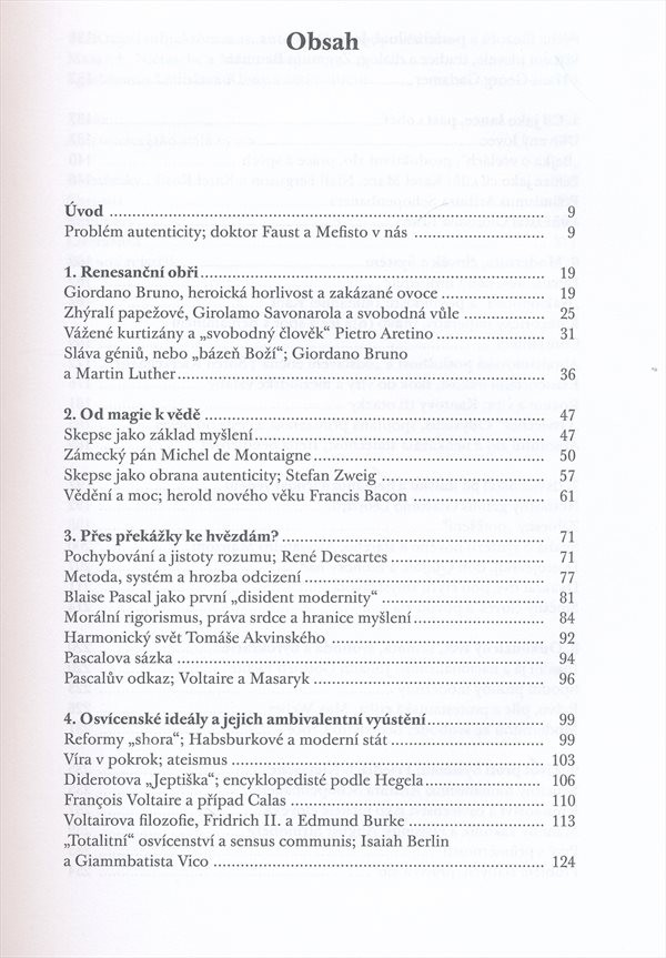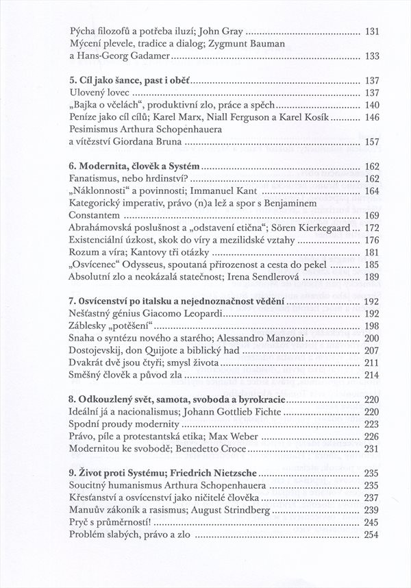 Autor se zabývá touto otázkou "v rozhovoru" s filozofy, literáty a myšlenkovými proudy od renesance přes osvícenství do moderní doby (např. G. Bruno, renesanční papežství, německá reformace, R. Descartes, M. de Cervantes Saavedra, I. Kant, J. W. Goethe, M. Stirner, křesťanství, T. G. Masaryk, rasismus, východní myšlenkové proudy). Zvláštní pozornost věnuje kriticky naladěným autorům, "disidentům modernity", kteří upozorňují na meze racionalismu a hédonismu (např. B. Pascal, A. Schopenhauer, F. M. Dostojevskij, F. Nietzsche, F. Kafka, M. de Unamuno, L. Klíma, M. Heidegger, český disent).