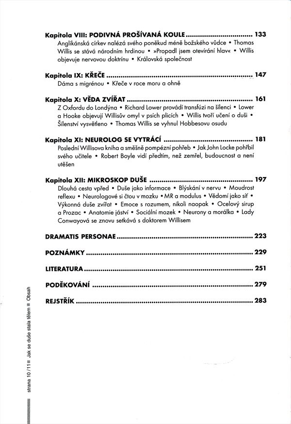 První pitvy lidského těla a výzkumy mozku proběhly již ve starověku. Otázky vztahu duše a těla představují jeden ze základních problémů, kterým se zabývali vědci i filozofové v průběhu celých dějin lidstva. Revoluční zvrat ve výzkumu mozku nastal v Anglii během 17. století. Tehdy lékař Thomas Willis, považovaný za prvního světového neurologa, prováděl průkopnické pitvy mozku. Spolu se svými přáteli, vědci a filozofy Oxfordského kroužku, položil základy moderní vědy o mozku. A právě příběh vědecké revoluce spjaté s objevováním mozku v Anglii 17. století je námětem knihy. Práce T. Willise a jeho přátel je zasazena do širšího společenského kontextu té doby, kdy se věda střetávala s náboženstvím. Ovlivňovaly ji politické poměry v zemi. Mozek přitahoval pozornost jak lékařů, tak filozofů. Jejich experimenty, provázené i osobními dramaty, změnili náš pohled na svět, člověka a jeho duši. Výzkumy mozku otevřely neurocentrický věk, trvající doposud. Knihu doplňuje bohatý poznámkový aparát, rejstřík, seznam literatury i přehled osob zmiňovaných v textu.