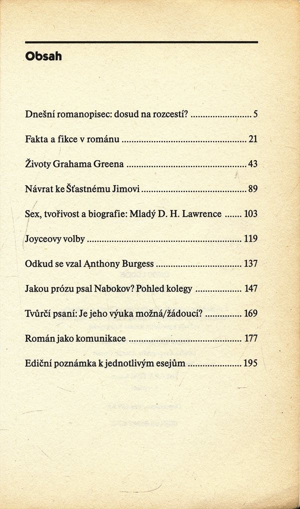 Autor velmi zasvěceně kombinuje složitější teoretické otázky s živou tematikou atraktivně zpracovaných literárních kritik, ve kterých se věnuje zvláště, i když ne výhradně, anglickým romanopiscům 20. století, včetně sebe. Jednotlivé literárněvědné texty se vyznačují svižnou dynamikou v uvažování, přesnými a výstižnými formulacemi a osobitým literárním stylem.