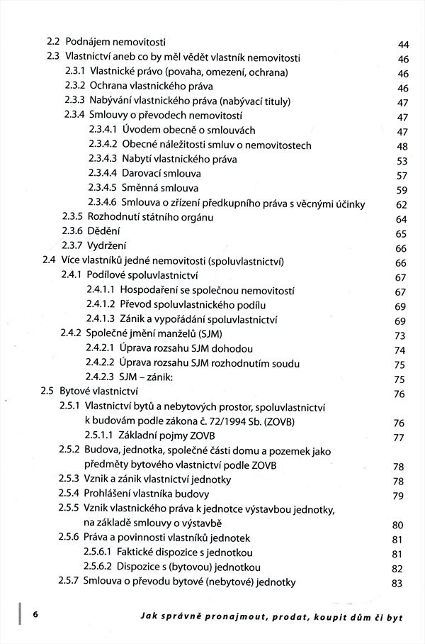 Příručka nabízí informace o právních předpisech a srozumitelně psané rady, jak se vyvarovat chyb při nakládání s nemovitostmi. Jejím cílem je seznámit všechny, kdo mají v úmyslu pronajmout, prodat nebo koupit nemovitost s aktuálními právními předpisy a jejich změnami a novinkami. Obsahuje vzory smluv, dohod i návrhů na vklad do katastru nemovitostí. Seznamuje také čtenáře s evidencí nemovitostí a druhy zápisů do katastru tak, aby se dovedl orientovat, případně dokázal kontrolovat svého právníka či realitní kancelář. Nakladatelská anotace. Kráceno.