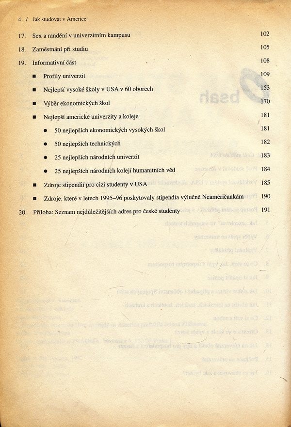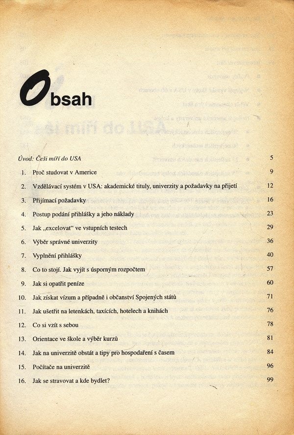 Velmi podrobné a názorné informace a rady o vzdělávacím systému USA, titulech, univerzitách, přijímacích řízeních - od podání přihlášky k vstupním testům -, o vízech, stipendiích, potřebných financích, o orientaci ve škole i kempusu, o stravování a bydlení aj. Obsáhlá část je věnována profilům jednotlivých univerzit a doplněna soupisem /podle pořadí úspěšnosti/ nejlepších vysokých škol. Závěrem uvedeny adresy zdrojů stipendií pro cizí studenty v USA.