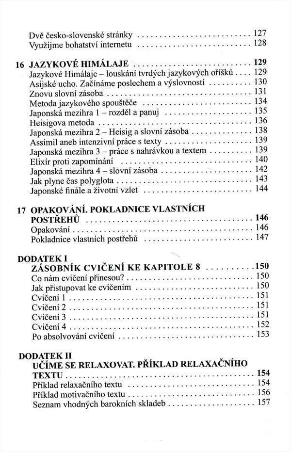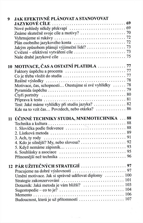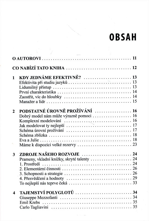 Autor se opírá o zkušenosti z dlouholetého studia jazyků a využívá modelu neurolingvistického programování (NLP). Seznamuje s úspěchy polyglotů a jejich přístupem ke studiu. Navrhuje vybudovat si svůj vlastní způsob studia. Nestačí pouze pokyny lektora jazykové školy. Uvádí výhody samostudia (vlastní tempo), nutnost pravidelného (hlasitého) čtení a využití internetu ke studiu. Text je doplněn testem aktivních znalostí (pro jakýkoliv jazyk) a cvičením různých typů. V závěru jsou uvedena nejfrekventovanější slova, úvodní a závěrečné věty v dopisech v angličtině, němčině, francouzštině a španělštině.