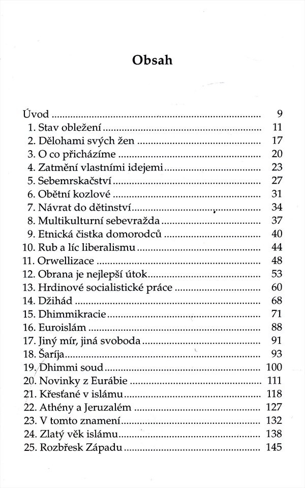 Autor vnímá blížící se katastrofu (politickou, kulturní, duchovní i fyzickou), proto čtenáře seznamuje se svojí vizí záchrany západní civilizace. Kapitoly se např. věnují jedinečnosti této civilizace, obhajobě Geerta Wilderse (kontroverzní nizozemský politik, kritik islámu), atp.