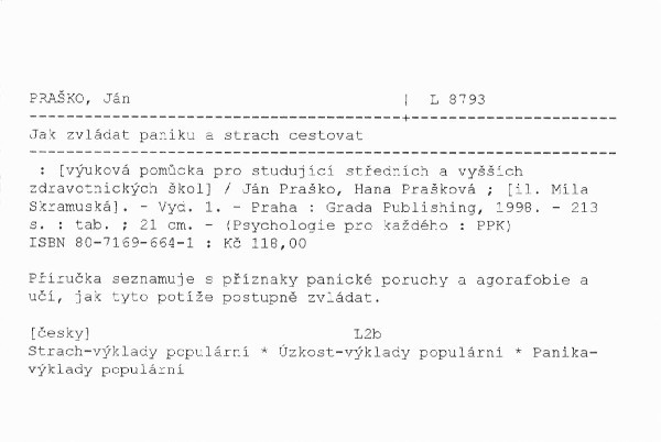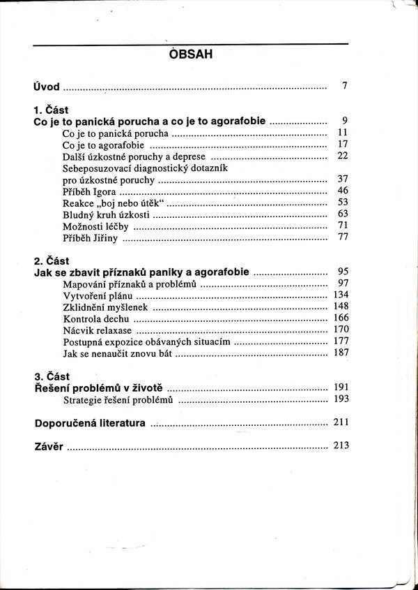 Publikace obsahuje informace o panické poruše /záchvaty silné úzkosti s nepříjemným tělesným doprovodem/ a agorafobii /strach ze záchvatu paniky v situaci, kde není dostupná pomoc/. Ilustrativní příběhy mohou být pomůckou k pochopení a řešení obtížné situace. V žádném případě však uváděné strategie léčby nemohou nahradit nezbytnou psychoterapii. 22.2.99 Votockoj