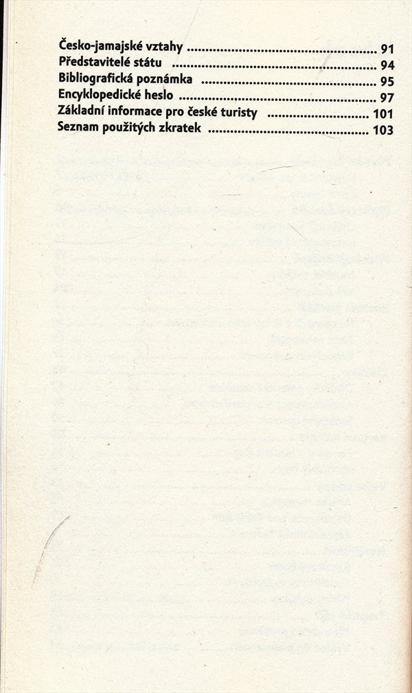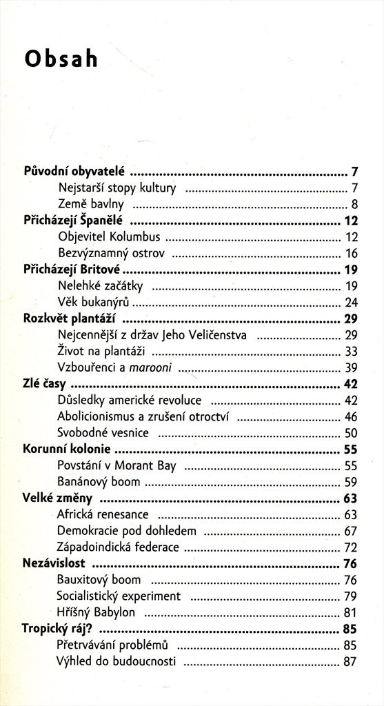 Historický vývoj od počátků osídlení do příchodu španělských kolonizátorů, španělská kolonizace a její vystřídání Angličany ve 2. polovině 17. století, Jamajka jako součást britské koloniální říše, popis vnitropolitického vývoje na ostrově od získání nezávislosti v roce 1962 do současnosti, stručný výklad česko-jamajských vztahů, encyklopedické údaje o zemi a základní informace určené českým turistům.