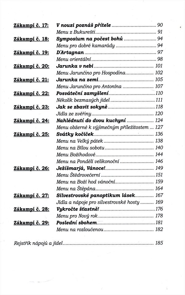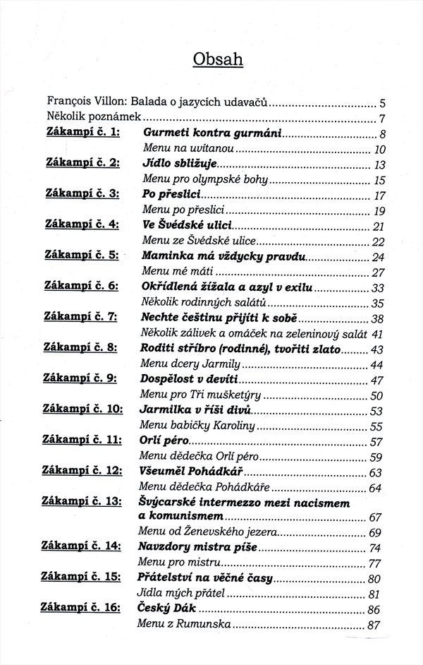 Autorka předkládá čtenářům předpisy z kuchyně své rodiny. Jak sama píše s humornou nadsázkou, jedná se většinou o pokrmy drahé, pracné a nezdravé, ale nevšední, z české i ze zahraniční kuchyně, ověřené rodinou i přáteli, které stojí za to vyzkoušet. Mezi jednotlivými menu vzpomíná na dětství, vypráví o své rodině, kde se láska a talent k vaření dědí již po několik generací, a o jiných blízkých lidech z jejího okolí. Doplněno o rodinné fotografie z archivu autorky.
