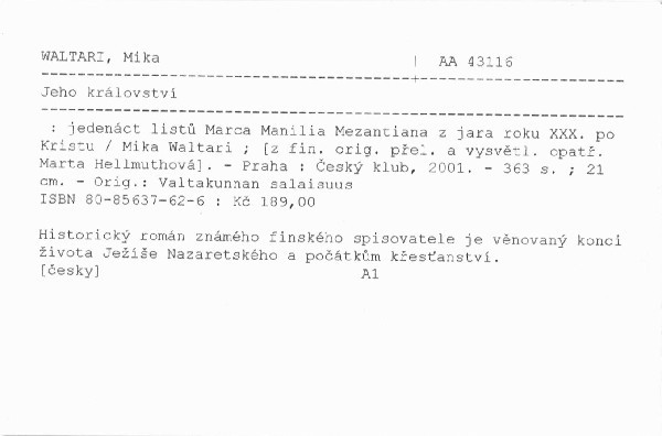 | Autor | Mika Waltari ; [z fin. orig. přel. a vysvětl. opatř. Marta Hellmuthová] |
