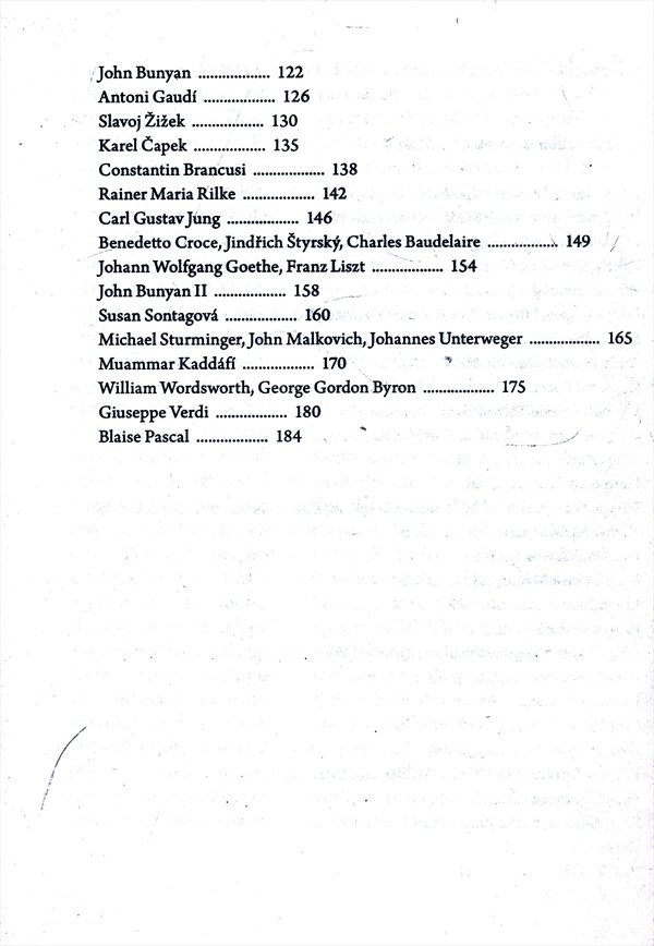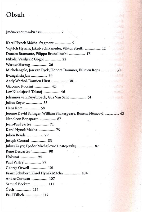 Neradostné úvahy nad aktuálnímí problémy, jež vystupují na povrch s koncem technokratické a postindustriální doby, jsou nadepsané jmény význačných postav světové i české literatury, kultury a umění. Nejedná se však o životopisné portréty: autor své vlastní postřehy, věnované různorodým tématům uměleckým, obecně kulturním či otázkám politicko-společenským, konfrontuje s myšlenkovým odkazem velikánů dob minulých. Jednotlivé texty vznikly v krátkém období let 2010-2011 jako deníkové záznamy o znepokojivé současnosti. Přinášejí mj. zamyšlení nad současným vztahem člověka ke krajině, nad hodnotami, jež vyznává současné umění, nad civilizací závislou na technických vymoženostech, které se lidem vymykají z rukou apod.