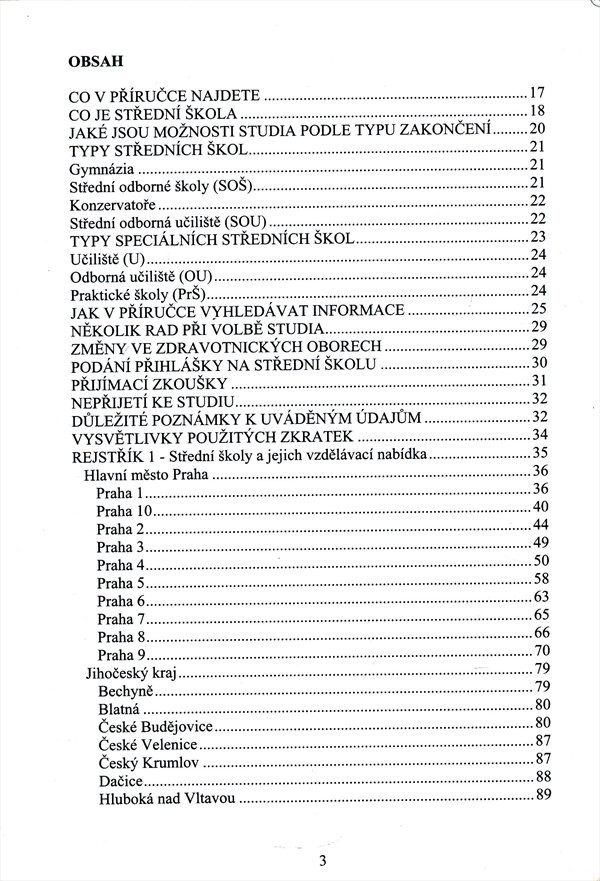 Určena všem zájemcům, kteří plánují vzdělávat se na některém z typů středních škol. Obsahuje přehled středních škol všech typů včetně kontaktů; nabídku studijních a učebních oborů (i nabídku pro méně úspěšné žáky); nástavbové studium pro vyučené zájemce; studium při zaměstnání - dálkové, večerní a externí formy studia; výběr oborů ve speciálních i běžných školách pro handicapované žáky.