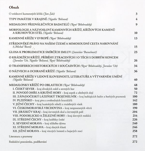 Navíc tyto drobné památky představuje v rozmanité atmosféře ročních dob, jako oprávněný krajinotvorný prvek ve všech oblastech naší vlasti. Úvodní kapitoly postihují tématiku kamenných křížů různou optikou, tedy pohledem historie, středověkého práva, smírčích smluv, typologie či jednotlivých příběhů, ale jsou také připomenutím nedávné minulosti a současnosti, ukazují, jak se tyto drobné památky neúnavnými a nadšenými lidmi udržují, zachraňují či znovuobnovují z hlubin minulých věků. V samém závěru dokončování knihy přišla myšlenka představit v malé galerii dávné i současné výtvarníky zachycující kamenné kříže. Hlavní, obrazová část je členěna podle krajů, a tak kniha může být jakýmsi speciálním průvodcem po kamenných křížích dané oblasti. Nakladatelská anotace. Kráceno.