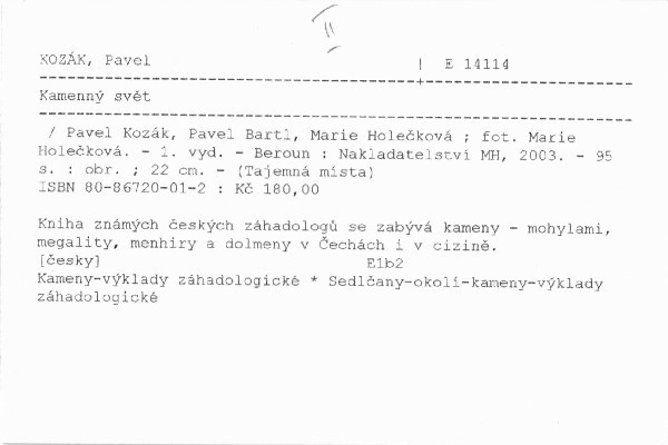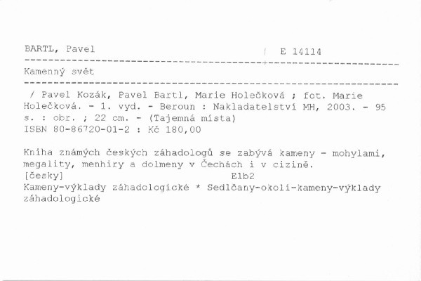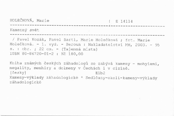 Kniha známých českých záhadologů se zabývá kameny - mohylami, megality, menhiry a dolmeny v Čechách i v cizině.