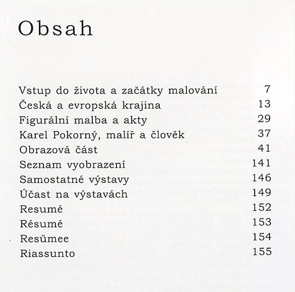 Publikace podává ucelený obraz na výtvarné dílo malíře Karla Pokorného. Textová část sleduje malířův umělecký vývoj, obrazová část představuje různé složky jeho tvorby (grafiky, krajinomalby, figurální malby atd.).