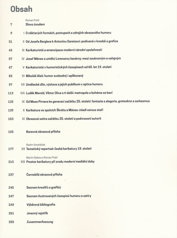 Kniha představuje karikaturu a další projevy humoru i satiry zejména v jejich vizuální podobě během "dlouhého 19. století". Naznačuje historické kořeny karikatury a sleduje její vývoj i souvislost s příbuznými obory - od optických hříček, fyziognomických a pantomimických studií přes specializované časopisy až po uplatnění humoru i satiry v plakátu a pohlednici. Odkrývá rozsáhlou oblast této tvorby v českých zemích i tvůrců odtud pocházejících - velmi proslulých (např. Mikoláš Aleš, František Gellner, Karel Hlaváček, Alfred Kubin, František Kupka, Josef Lada, Josef Mánes, Luděk Marold, Jakub Schikaneder, Hanuš Schwaiger, Max Švabinský), ale zároveň i mnoho dnes téměř neznámých, ovšem ve své době velice výrazných tvůrců obrazového humoru. Nakladatelská anotace. Kráceno.