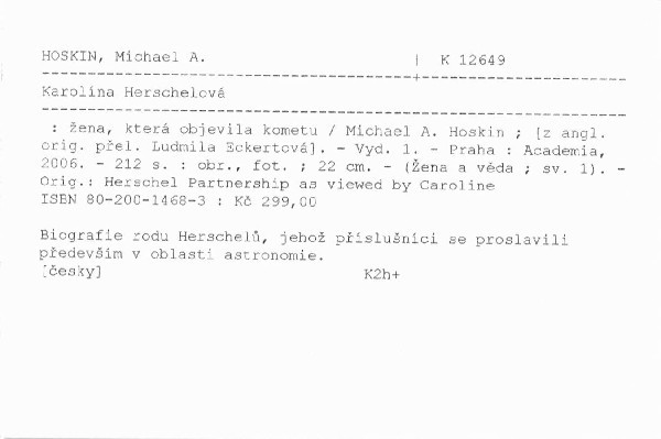 Velmi zajímavě a čtivě napsaná biografie rodu Herschelů (především Karolíny Herschelové a jejího bratra Williama), jehož kořeny sahají až do moravské vesničky Heršpice u Slavkova. Karolína Herschelová se stala první "profesionální astronomkou", které byl v roce 1787 přiznán králem Jiřím III. plat za práci asistentky královského astronoma, jejího bratra Williama. Nejen její bratr byl významným astronomem (objevitel mlhovin a dalších netypických vesmírných jevů), ale sama Karolína objevila osm komet a stala se uznávanou astronomkou i mezi muži své doby.