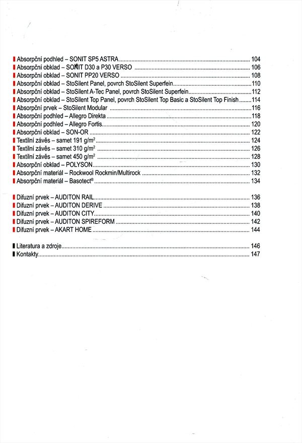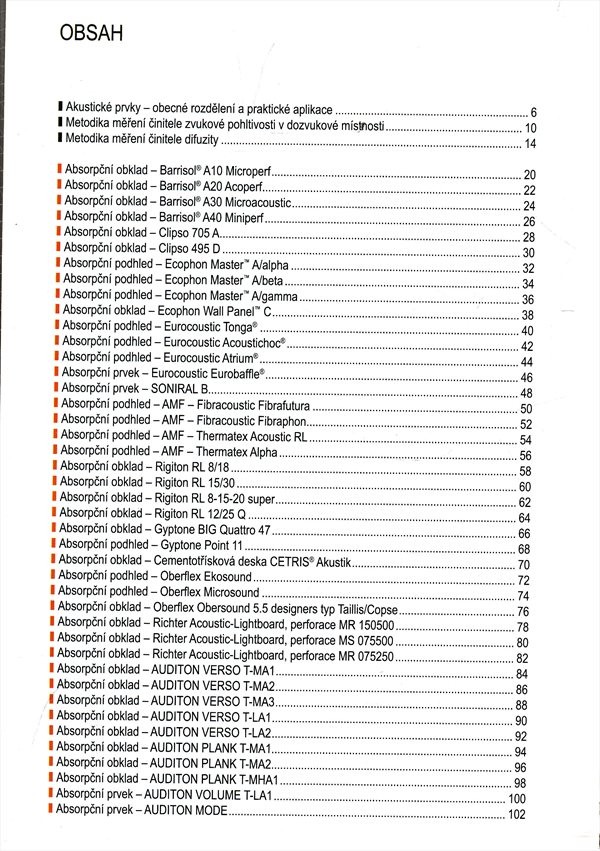 Publikace je souborem aktuálních informací o vlastnostech akustických prvků a výsledků měření hodnot činitele jejich zvukové pohltivosti a difúzních prvků s hodnotami činitele difuzity. Slouží též jako katalog dostupných produktů prostorové akustiky.