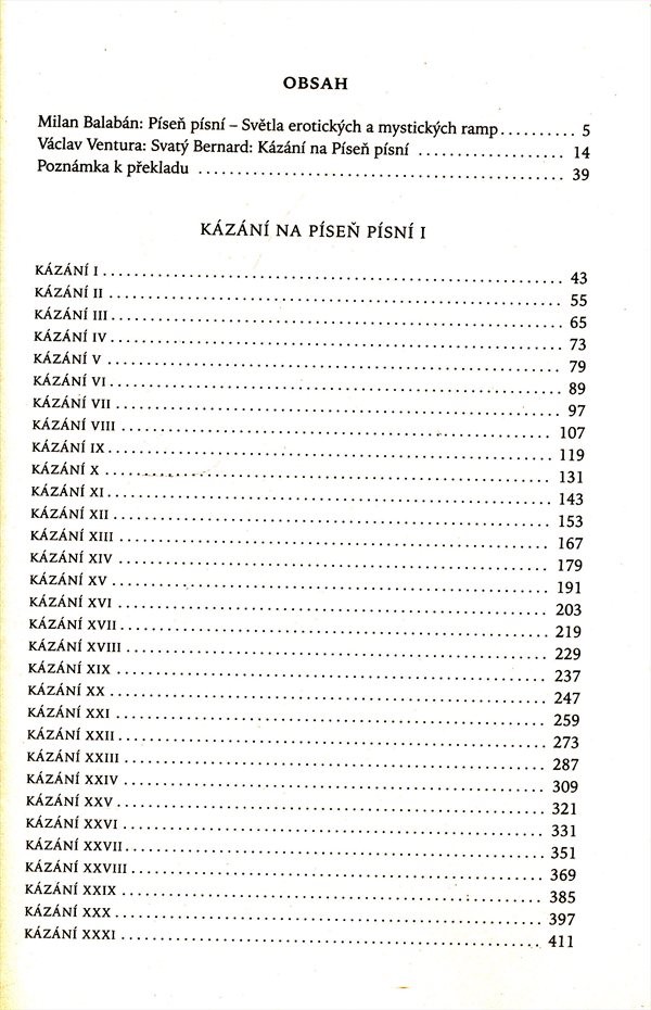 Překlad prvních 41 kázání (inspirovaných biblickým textem Píseň písní) od Svatého Bernarda (1090 - 1153) - církevního učitele a reformátora církve. Doplněno dvěma úvodními studiemi od M. Balabána a V. Ventury.