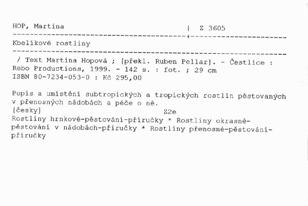 Tradice pěstování okrasných rostlin v různých druzích a typech přenosných nádob. Vysvětlení pojmu "kbelíková rostlina" a její popis s přehledem vlastností a potřeb. Obecná pravidla pro pěstování a návody na množení. Textovou část doprovází barevné fotografie, slovníček základních pojmů, rejstřík latinských a českých názvů rostlin. Much Z2e