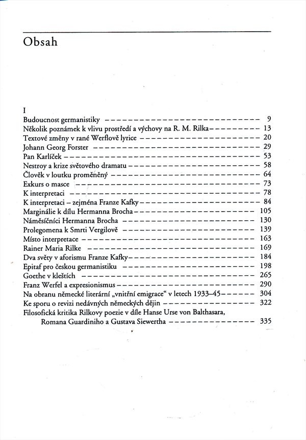 Jedná se o tématicky velice různorodé literárně-vědné (např. Goethe, Rilke, F.Kafka, Werfel), germanistické (např. současný stav i perspektivy oboru) a filozofické (např. Guardiniho interpretace Rilkeho díla) texty. První díl tudíž pojednává především o některých aspektech života a díla významných německy píšících spisovatelů.