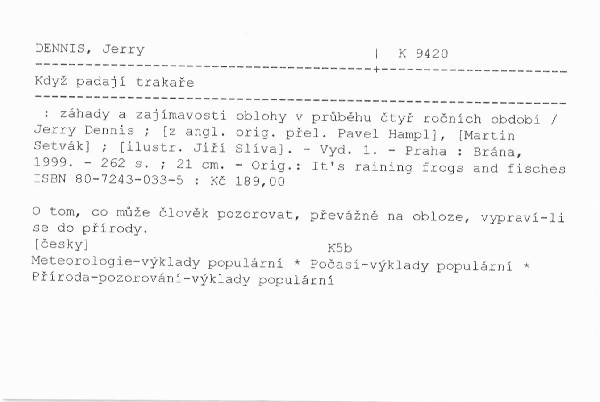 | Autor | Jerry Dennis ; [ilustr. Jiří Slíva] ; [z angl. orig. přel. Pavel Hampl], [Martin Setvák] |