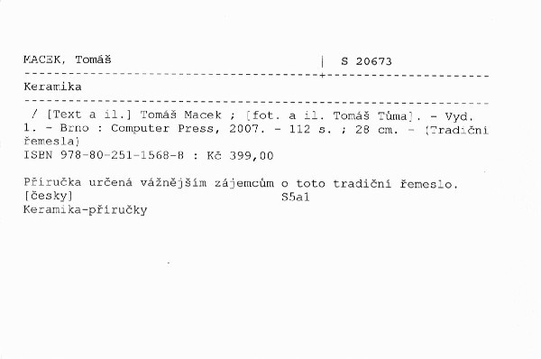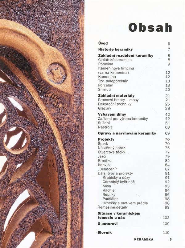 První část seznamuje s historií oboru po technické stránce - druhy keramiky, materiály, glazury a receptury na jejich přípravu, nástroje a vybavení keramické dílny. Druhá část nabízí čtrnáct projektů na konkrétní výrobky - šperk, nástěnný obraz, tácky, ježci, krmítko, konvice... Knihu uzavírá slovníček odborných pojmů.