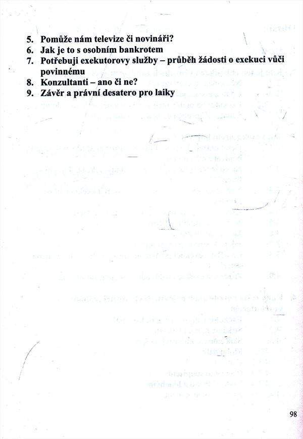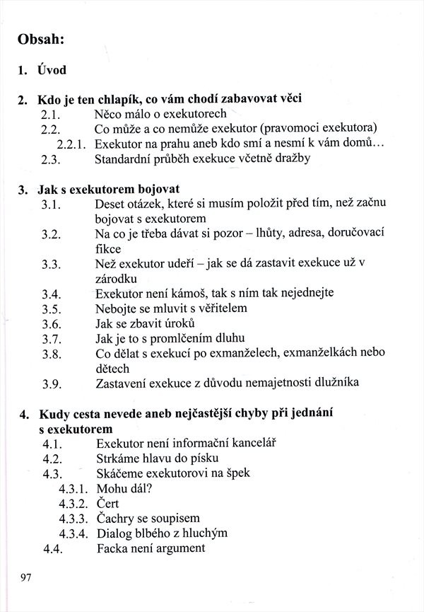 Kniha přibližuje laické veřejnosti problematiku exekucí, daní a jiných pohledávek. Snaží se čtenářům poskytnout praktické rady a tipy, jak postupovat při exekuci či jaká práva a povinnosti mají jak dlužníci, tak věřitelé. Publikace upozorňuje na mezery a nejednoznačnosti právní legislativy, na nejčatější chyby při jednání s exekutory nebo jak se co nejjednodušeji zbavit úroků. V závěru je stručně charakterizováno právní desatero pro laiky.