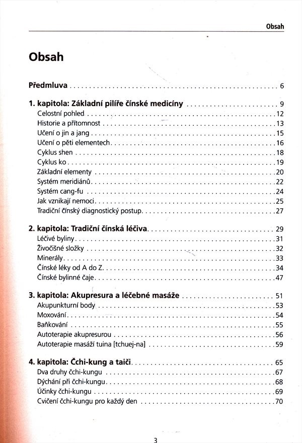 Příručka poskytuje úvod do čínské medicíny, jež poskytuje vysvětlení koncepcí a idejí, na nichž spočívá tradiční čínská medicína. Nabízí podněty a léčebné pomůcky k posílení organismu při běžných zdravotních potížích.