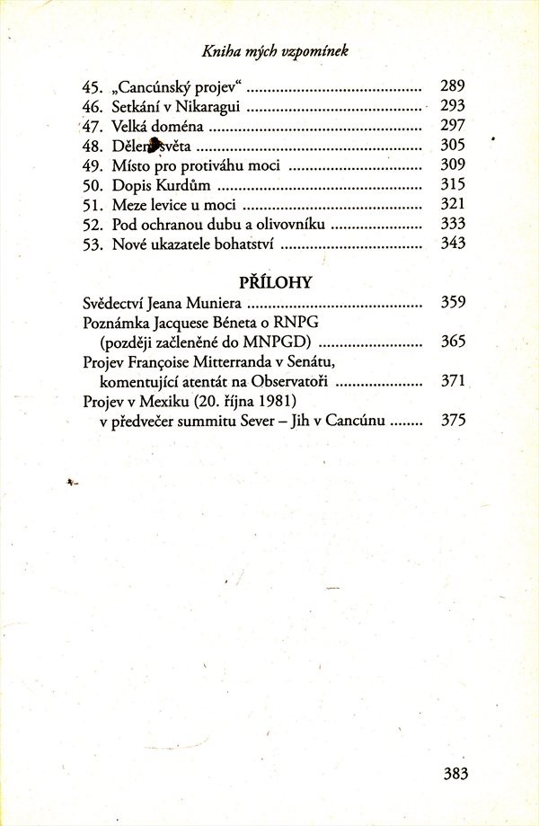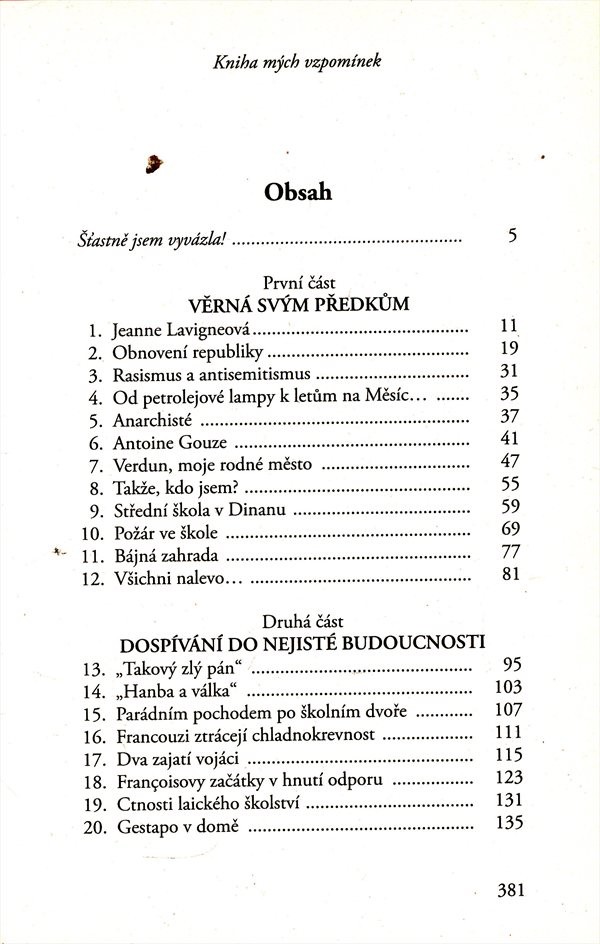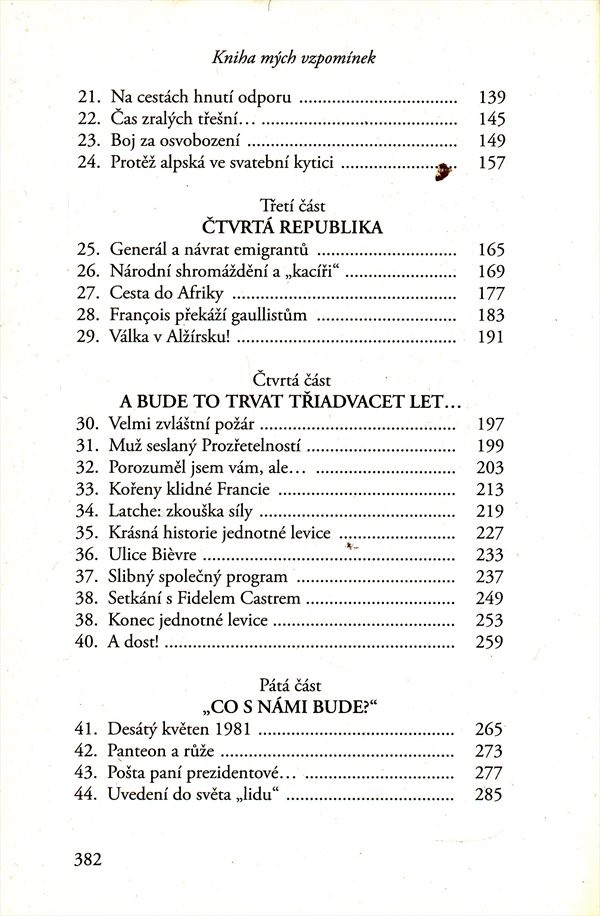 Jak se mohla nenarodit - touto vzpomínkou z dětství z úst svého staršího bratra začíná líčit svůj život, prostředí, v němž vyrůstala, i to, do něhož ji přivedl její druh v odboji a později muž, francouzský prezident a socialista François Mitterrand. Možná právě jemu je věnována větší část knihy, už proto, že se Danielle snaží rozptýlit různé pomluvy, které se kolem něj také šířily. V jejím vyprávění však nezůstaneme jen v okruhu Elysejského paláce. Vždyť doprovázela svého muže na cestách po světě, sama také hodně cestovala a její osobní postřehy o různých státnících včetně Fidela Castra, jsou velmi zajímavé. Stejně jako charakteristiky francouzských politiků, nevyjímaje věčného Mitterrandova rivala Charlese de Gaulla. Není to její první kniha vzpomínek, a proto je vyzrálá - jako víno z vinic jejích předků v burgundském kraji.