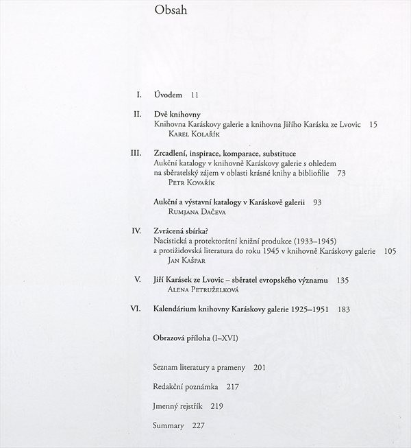 Publikace obsahuje pět statí od různých autorů. Všechny pojednávají o Karáskově knihovně. Jiří Karásek ze Lvovic byl prozaik, výtvarný kritik a významný sběratel 1. poloviny 20. století. Od mládí sbíral výtvarné umění (hlavně kresby a grafiky) a literaturu o něm včetně aukčních katalogů a katalogů výstav (Karáskova galerie). Postupně svou sbírku rozšířil i o beletrii a jinou literaturu a tím vznikla Karáskova soukromá knihovna. V roce 1925 Karásek svou galerii i knihovnu daroval Československé obci sokolské, která ji umístila do malostranského Tyršova domu. Zde byla přístupná veřejnosti. Karásek knihovnu nadále spravoval a rozšiřoval: dostával mnoho darů od spisovatelů nebo získával pozůstalosti. Knihovnu tvořilo na čtyřicet tisíc svazků. V roce 1955 byla knihovna přemístěna do Památníku národního písemnictví na Strahově. Publikace dále obsahuje kalendárium, obrazovou přílohu, jmenný rejstřík, bibliografii.