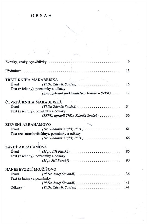 Třetí kniha makabejská, Čtvrtá kniha makabejská, Zjevení Abrahamovo, Závěť Abrahamova, Nanebevzetí Mojžíšovo, Modlitba Menašeho, Ódy Šalomounovy, Syrské žalmy, Josef a Asenat. Závěrečná část třídílného výboru nejzávažnějších židovských pseudepigrafů (apokryfů), předkřesťanských a raněkřesťanských spisů sepsaných pod falešnými jmény starozákonních a mimobiblických osobností. Apokryfy, dosud většinou v češtině nevydané, přinášejí cenná svědectví o židovském národě i o biblických dějinách.