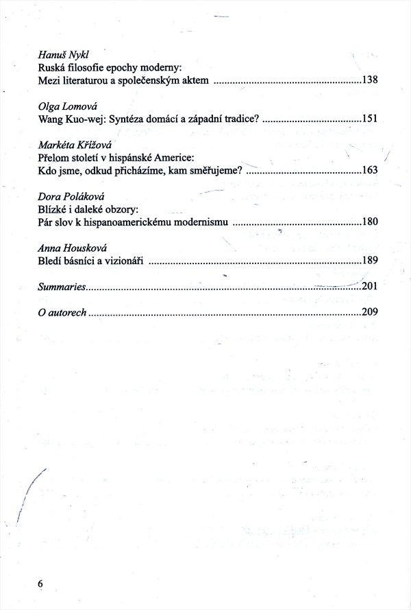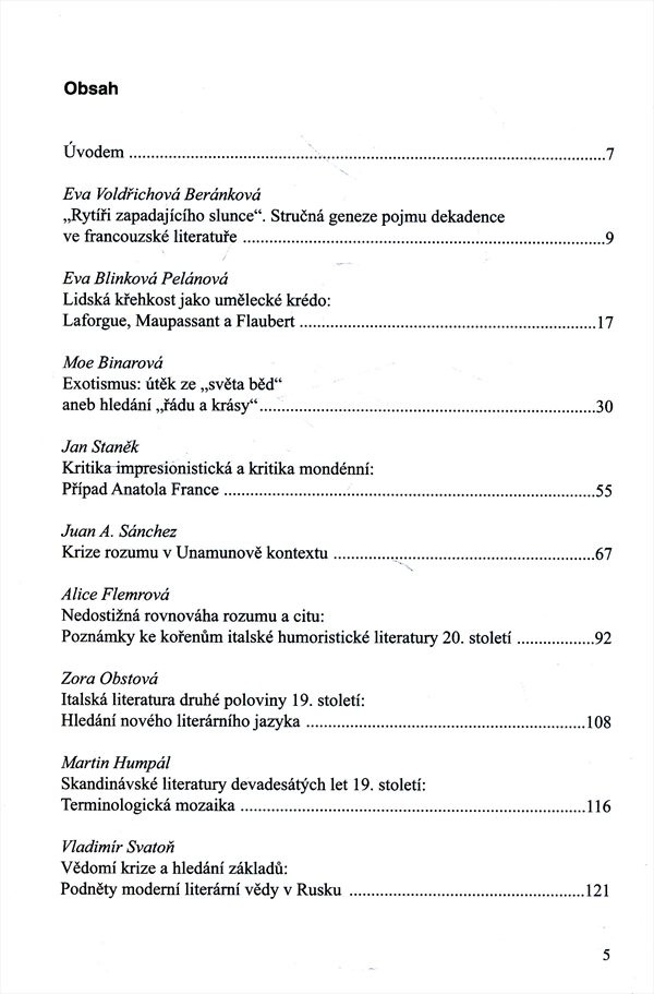 Monografie je kolektivním dílem autorů pod vedením proslulých literárních vědců, Anny Houskové a Vladimíra Svatoně. Studie reflektují společné aspekty i odlišnosti širokého kulturního hnutí, které na přelomu 19. a 20. století probíhalo napříč kontinenty. Konec 19. století bývá přirovnáván k evropské renesanci na počátku novověku. Studie se zabývají genezí rozmanitých pojmů, duchovních proudů i některými díly jejich výrazných představitelů. Literatura konce století tematizuje zajetí v materiálním světě, z toho pramenící smutek, ukazuje lidskou existenci jako prchavou, hledá východiska v útěku ze světa běd do prostoru uvnitř, do umělých rájů, exotických světů. Sen, mýty, magie tvoří pilíře většiny přírodních národů (netradiční interpretace na literárním a výtvarném díle Paula Gauguina). Jinou protiváhou je uvažování nad kritickým dílem Anatola France. Krize rozumu v kontextu Unamunově (zápas mezi rozumem a vírou) a přelomové směřování hispánské americké literatury. Z dalších studií je nepřehlédnutelný ruský formalismus a jeho kořeny. Hlavní těžiště myšlení a literatury 20. století je téma života, reflexe života v jeho konkrétnosti a zároveň v jeho kosmické dimenzi, jednoty v protikladech, která je společná celé západní kultuře. - Uvedené studie jsou součástí výzkumného úkolu "Kultury jako metafory světa" v rámci Programu rozvoje vědních oblastí na UK. - Slovník autorů studií.
