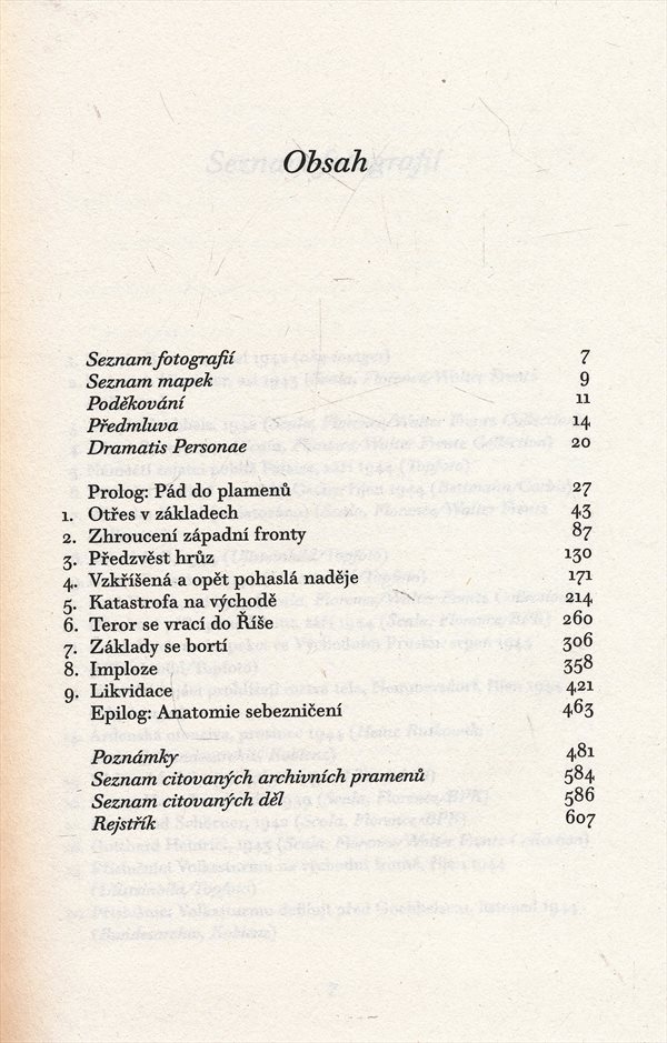 Britský historik ve své práci mapuje vnitřní situaci v Německu od neúspěšného atentátu na Hitlera do německé kapitulace v Karlshorstu v květnu 1945. Sleduje následky zmařeného atentátu, reakci režimu, upevnění mocenského postavení některých nacistických pohlavárů, zhoršující se situaci na východní i západní frontě, rychlý úpadek morálky obyvatelstva, působení propagandy, chování Hitlera v souvislosti s neodvratně se blížícím koncem i ukončení bojových operací v Německu a střední Evropě.