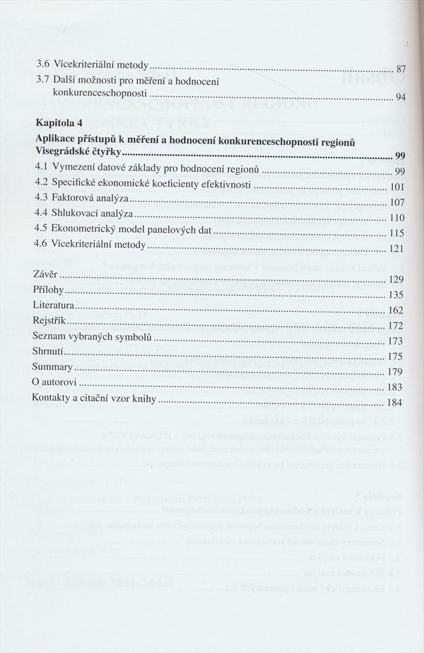 Monografie přináší různé metody a postupy, pomocí kterých je možné měřit konkurenceschopnost regionů v rámci zemí Visegrádské čtyřky.