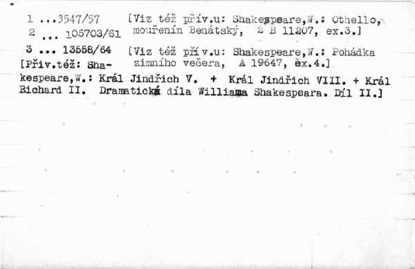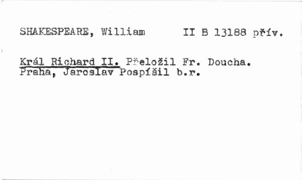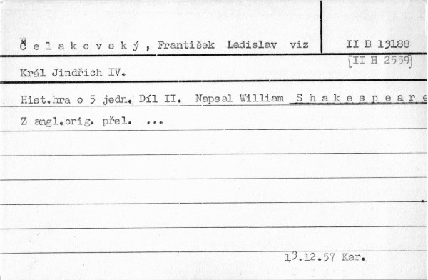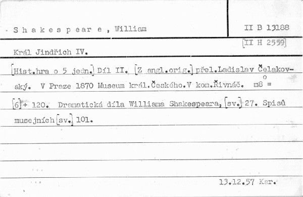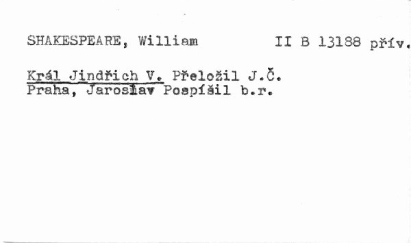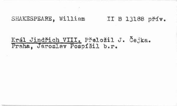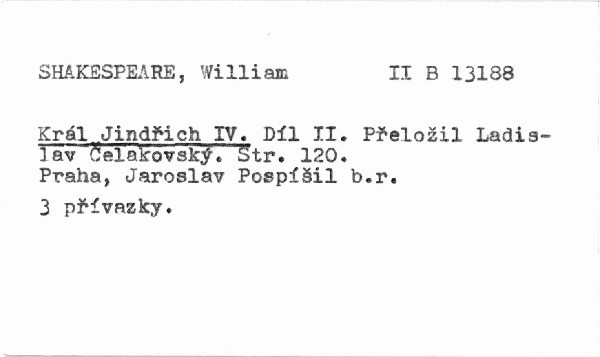 Král Jindřich IV., díl druhý - přel. Čelakovský - 1870 Král Jindřich V. - Čejka - 1858 Král JIndřich VIII. - Čejka - 1870 Král Richard II. - Doucha - 1870?