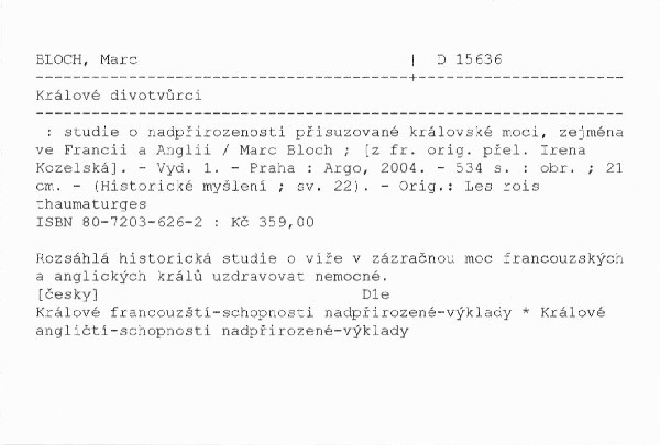 | Podnázev | studie o nadpřirozenosti přisuzované královské moci, zejména ve Francii a Anglii |