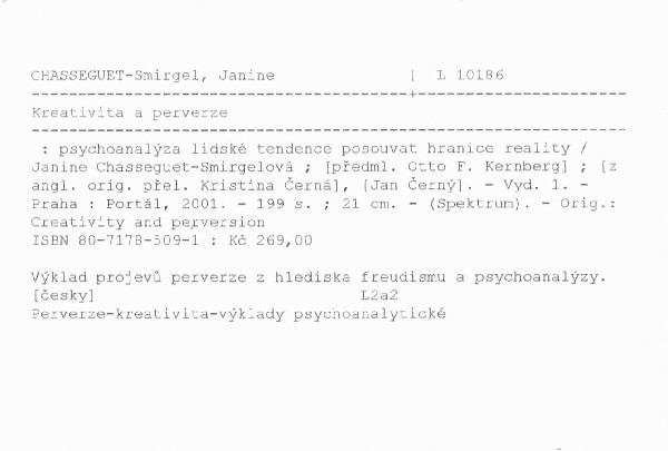 | Autor | Janine Chasseguet-Smirgelová ; [předml. Otto F. Kernberg] ; [z angl. orig. přel. Kristina Černá], [Jan Černý] |